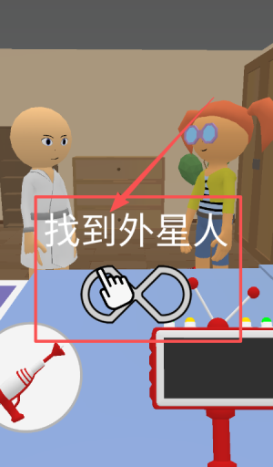 2、进入室内人物场景后,按照白色手形光标的提示,点击灰色无限符号图标,开始寻找图中隐藏的外星人。