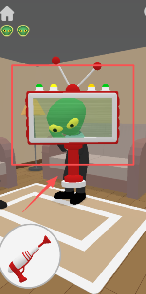 4、在部分外星人相关场景里,依据左下角红色箭头的指引,拿起红白配色的激光枪,对准放置在红色复古电视机上的外星人,执行射击动作。