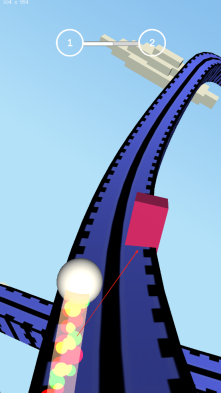 2、行进过程中要留意轨道前方的标识:黄色警示区意味着前方轨道即将断裂,需要提前降低速度并稍微调整角度;蓝色加速带可以通过长按屏幕来积攒动能,帮助顺利通过环形弯道或者悬空的长轨道。