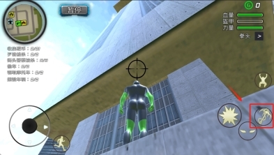 3、点击右下方的蛛丝射击按钮,即可借助蛛丝攀爬摩天楼,并释放对应的技能。