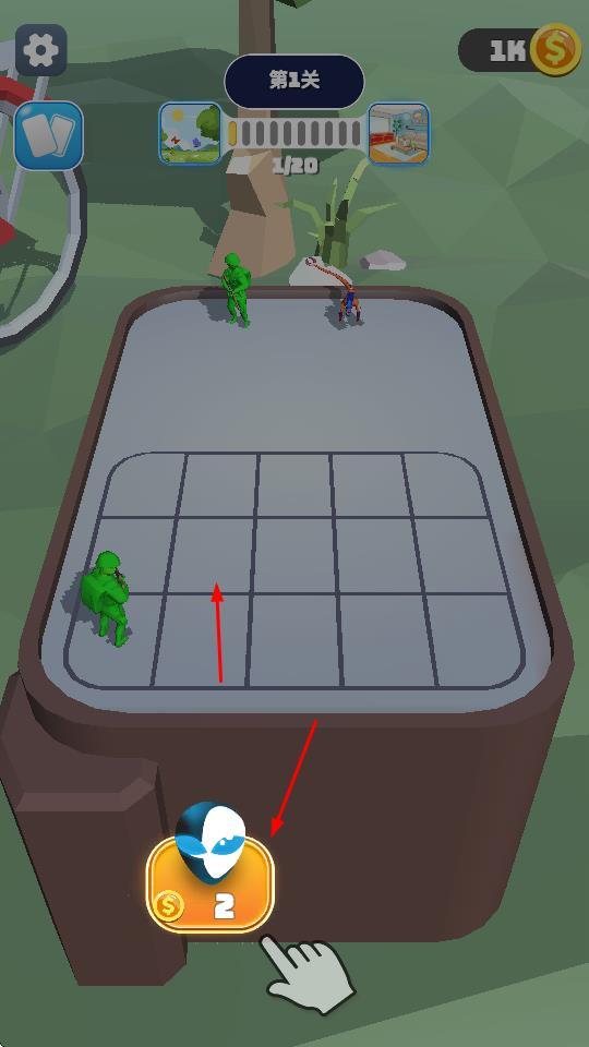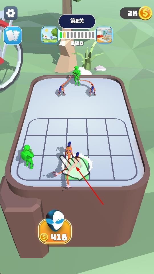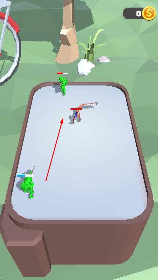 1、在战场中拖动角色,使其沿着红色箭头的方向移动,当靠近绿色敌人时会自动发起攻击,通过消耗敌人的血量来击败对手。
