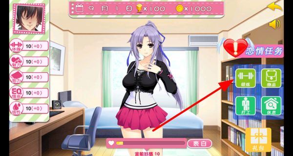 3、点击锻炼等选项能够提升自身属性,从而让女友更有魅力,此外还能参与恋情任务。