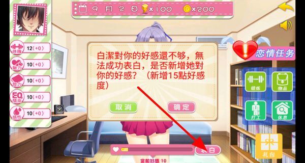4、和自己喜欢的对象进行互动,当彼此之间的好感度达到一定程度时,就可以试着去表白;要是好感度还不够的话,也可以先通过一些方式增加好感度,之后再去表白。