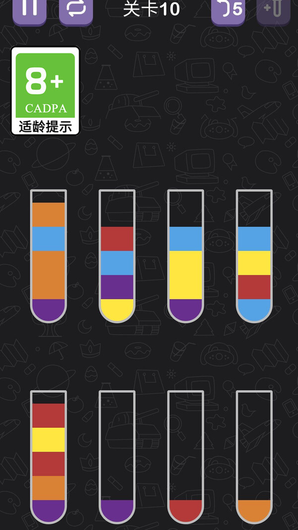 《拼来拼去》是一款趣味益智解谜类闯关游戏。游戏中,我们需要对试管里的彩色液体进行分类操作,让相同颜色的液体汇集到同一支试管中。不过,由于每一关都设有步数限制,这项分类任务可没那么容易完成——每一步操作都得经过周密思考,只有用尽可能少的步数达成目标,才能以三星满星的优秀成绩顺利通关哦!