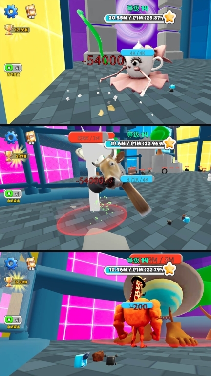 1、和奇特的角色展开战斗,施展充满魔力的攻击进行输出,搭配随机出现的强化道具,全力争取胜利。