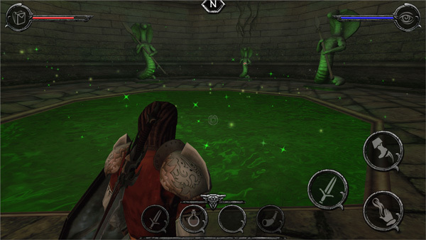 1、玩家进入神庙后会遇到绿色毒液池,这片区域布满毒液,只要接触就会死亡(没错,一旦掉下去就会殒命)。看到毒液池附近的箱子了吗?得利用它,借助风之符石(rune of Wind),准备好10瓶魔力药水,搭建出通道,然后一步步跳过去。