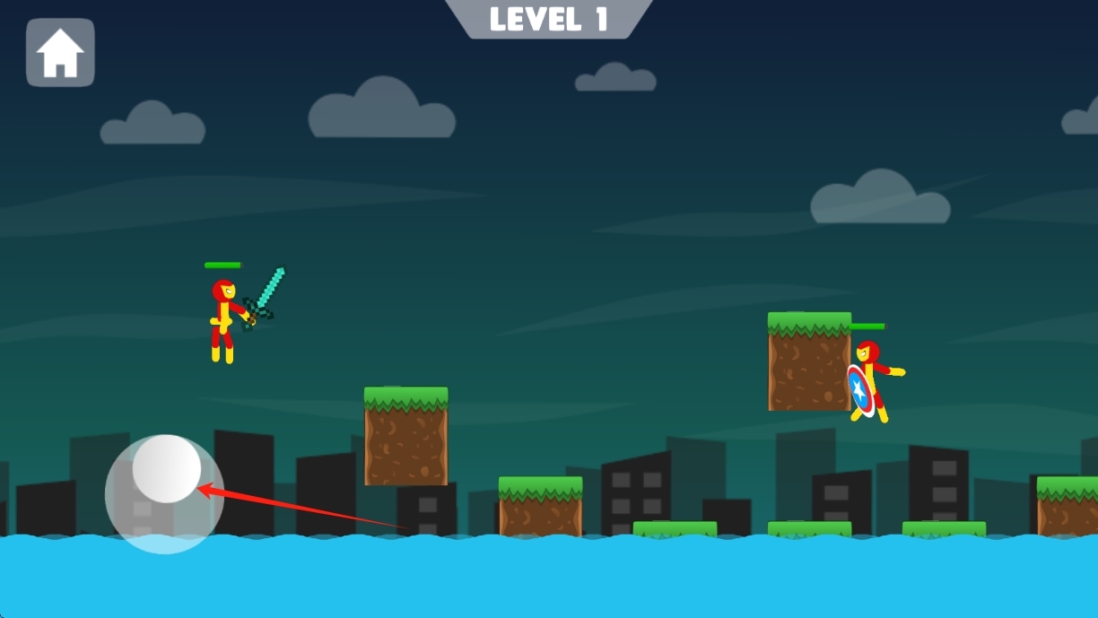 3、第一关的战斗场景中,你需要按照箭头的提示来操作火柴人参与战斗,击败对手;同时,通过拨动轮盘可以控制人物移动。