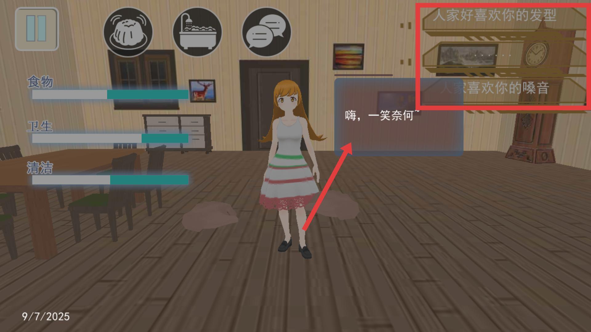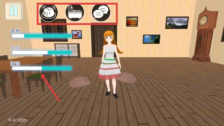 2、在游戏界面查看食物、卫生、清洁对应的状态条,根据实际需求来选择食物、洗澡或者对话选项。