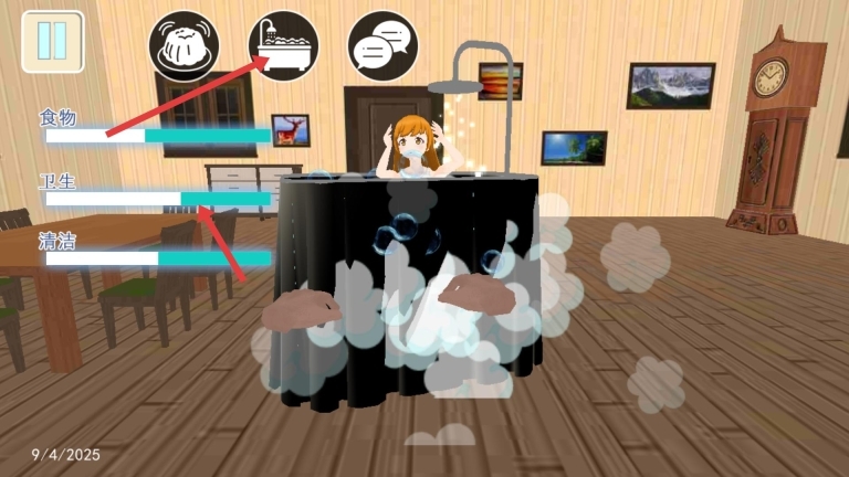3、点击洗澡图标,让角色执行洗澡动作,以此提升其卫生状态,过程中注意观察状态条的变化情况。