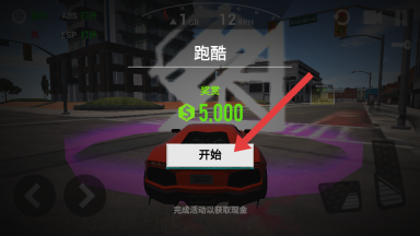 2、驾车前往紫色任务区域,此时会弹出跑酷任务界面,点击开始按钮即可参与跑酷活动,完成该挑战能获得$5000的奖赏。