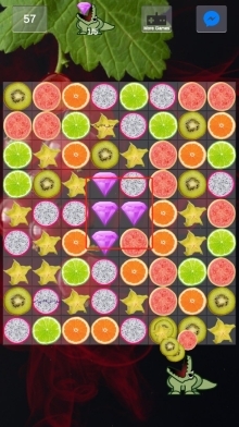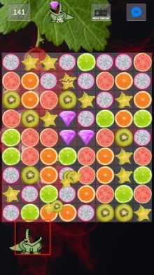 1、先观察水果的布局情况,重点优先消除红框内紫色钻石周围的水果,促使钻石下落,再利用消除产生的特效来触发连锁反应,从而完成钻石的收集。