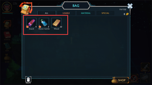 2、进入游戏场景后,点击左边的【BAG】按钮就能打开背包,在这里可以查看并管理自己目前拥有的各种资源物品。