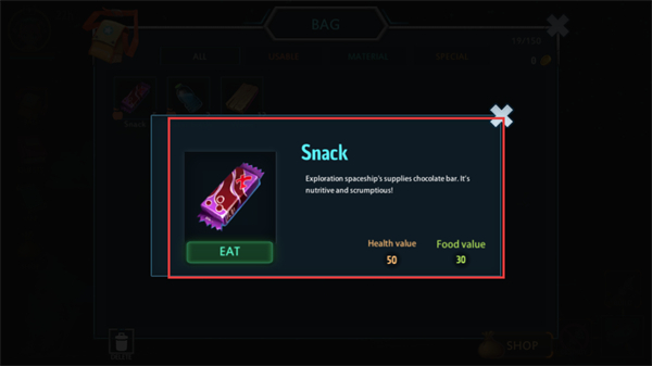 4、使用【Snack】能够恢复50点生命值与30点饱食度,帮助保持良好状态。