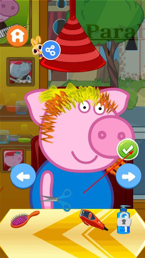 进入游戏后,先挑选小猪佩奇这类角色作为客人,接着点击造型工具来了解客人的发型需求,最后拖动发剪工具就可以开始修剪基础发型了。
