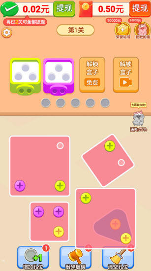 4、在游戏里获取道具能够降低游玩难度,多样的道具均可使用,像增加孔位、敲碎玻璃、清空孔位之类的功能都能借助道具实现。