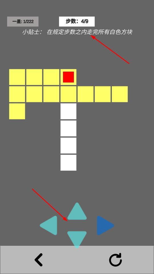 2、需借助方向按钮操控角色,在限定步数内通过所有白色方块,避开障碍物,稳步推进以完成关卡。
