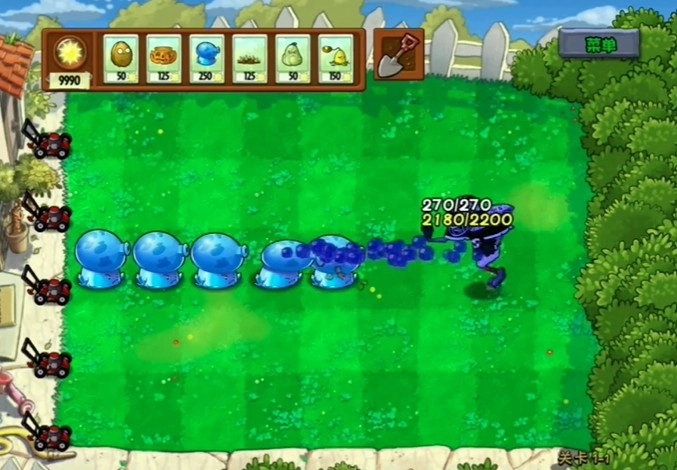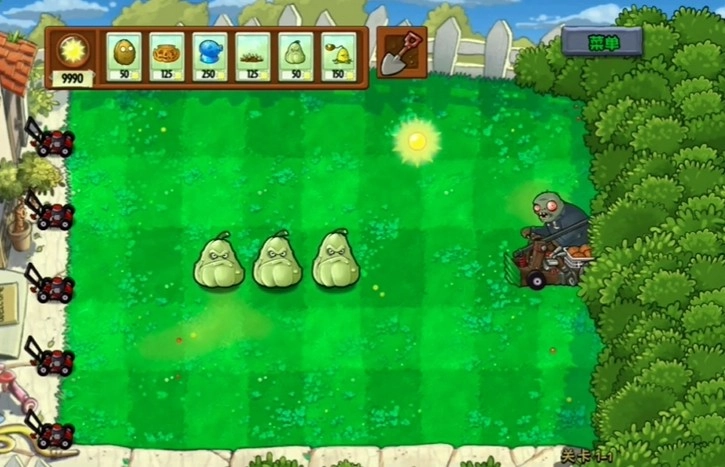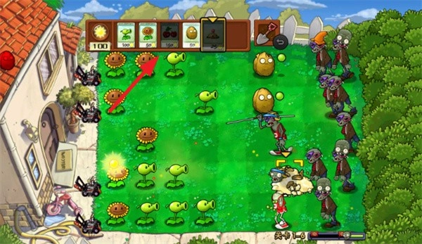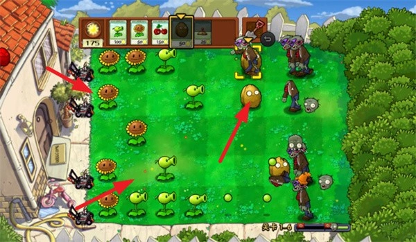 3、僵尸往往会迅速袭来,通常建议把坚果摆在最前面,向日葵放在最后方,中间则可以放置一些具有输出能力的植物。