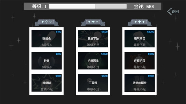 6、钱能用来做什么呢?它可以购买天赋,像二段跳、喷气背包这类都能买到。其中最实用的天赋莫过于二段跳、快速落地(跳起来时按翻滚键就能快速落地)、护盾(开局自带护盾),还有魔法球(能一边翻滚一边跳跃,特别好用,刚玩的话一定要买)。不过天赋是分等级的,从1级到3级不等,等级越高的天赋效果越强,价格也越贵。