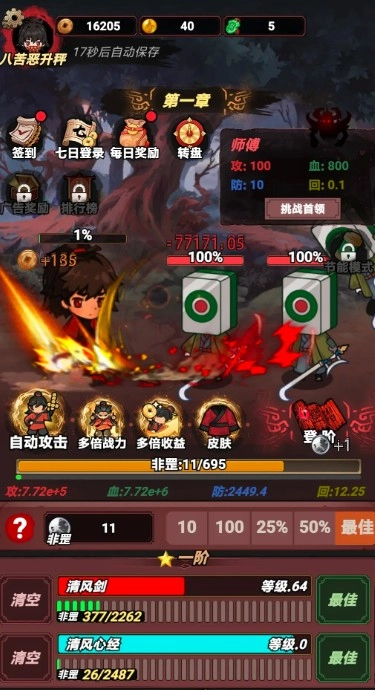 3、玩家能够通过点击屏幕操控李火旺攻击坐志道,以此开展修假历练,持续增强自身的实力。