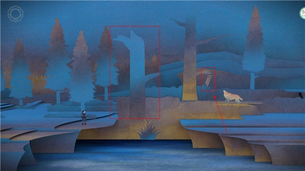 2、双击屏幕后向右移动,会发现下方有河流阻挡无法通过。接着沿屏幕最下方滑动,就能拉出风铃,此时狼会趴下(后续遇到狼的地方,需先找到相同的风铃)。之后会出现一座桥,从桥上走过,即可进入下一个场景。