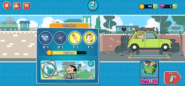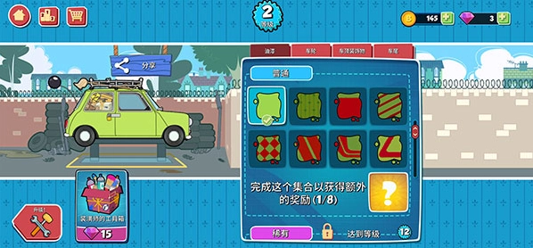1、用油漆、车轮、车顶装饰和车尾部件来升级他的绿色古董车。集齐所有这些配件就能获得特别奖励!