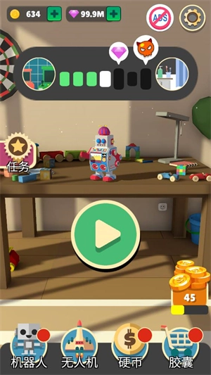 5、在主界面点击机器人按钮,既能更换配件,也能消耗金币对机器人进行升级。