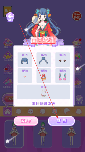 进入游戏后,在“每日签到”界面点击“签到”按钮即可完成签到,连续签到能获得发型、眼睛、服装、鞋子等各类服饰部件奖励,帮助你更好地装扮角色。