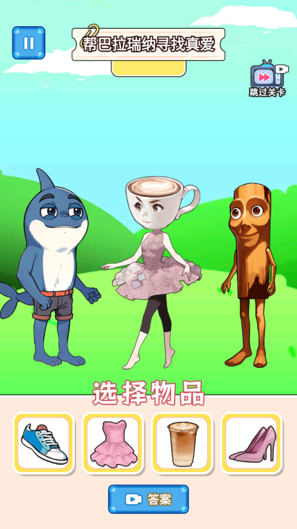 1、第一关首先观察角色外观,鲨鱼人穿着休闲装,需要挑选与之对应的鞋子和短裤,以此快速贴合其形象。