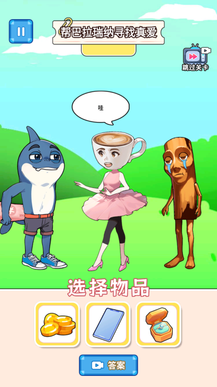3、第三关的目标是营造浪漫氛围,选择戒指这一道具,就能触发一段甜蜜的剧情,助力鲨鱼人顺利完成告白。