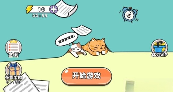 1.进入游戏后,你会看到两只慵懒的猫咪正说着“整理整理吧”。