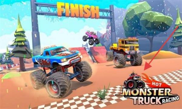 3、收集黄色$形状的金币,超越蓝色或紫色的对手车辆,奋力冲过写有“FINISH”字样的终点线,赢下比赛并解锁全新的卡车和赛道。