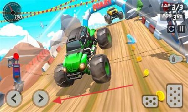1、挑选怪物卡车(红色、绿色等颜色可选),进入越野赛道(沙漠、雪地等场景),通过左右方向键控制车辆方向,避开途中的障碍物(如岩石、水坑)。