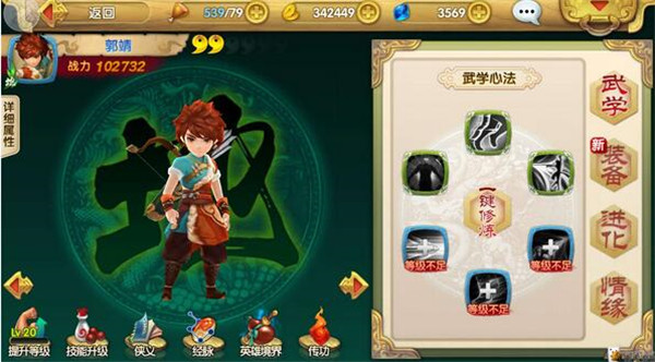3、当英雄心法栏里的所有经书槽都装备上经书后,该英雄就能进行升阶操作。