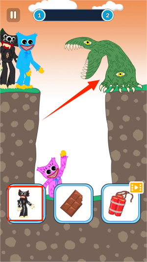 2、哎呀,她掉进坑里了,对面有一只大恐龙,坑下面有两个工具,选其中一个来救她吧。
