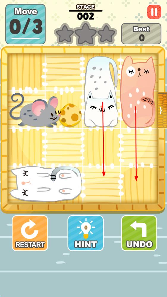 2、拼图关卡挑战:在超过2000个拼图关卡里,逐步猫咪布局的谜题,借助特殊道具或提示,在不惊醒猫咪的情况下达成每关的逃离目标。