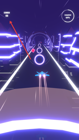 2、进入关卡后,操控飞机在霓虹隧道中飞行,注意前方的紫色环形障碍,要让飞机精准地撞上这些圆环,以此推进游戏进程。