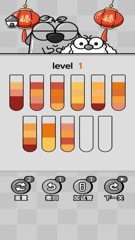 2、配备重置关卡重新开始、撤回操作回到上一步、增加试管作为中转容器这三种辅助功能,助力玩家应对不同难度的挑战。