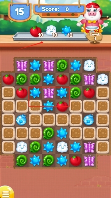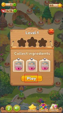 1、点击关卡界面上的黄色Play按钮,进入Level1关卡。此关卡需要收集苹果、云朵和蓝星这三种食材,玩家可通过消除对应的元素来完成收集目标。