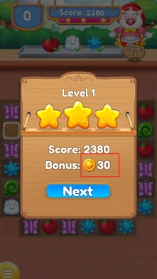 3、关卡结束后,界面会显示2380的分数以及30个奖励金币,点击蓝色的Next按钮,就能进入下一关继续进行食材收集的挑战。