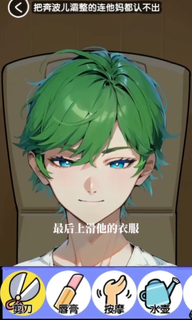 5. 用去皱精华涂抹面部,拿镊子拔除胡须,敷面膜让肌肤变白,用眉笔修饰眼部轮廓,先把嘴巴修小再涂抹润唇膏,面部按摩时提拉下巴三次,将种子种在头顶并浇水,用剪刀修剪“草”,向上划动衣服。