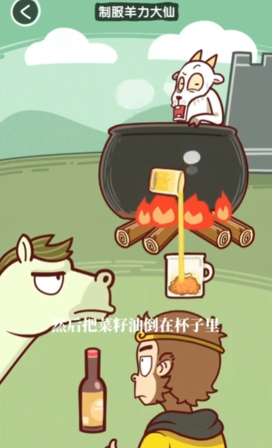 7. 把大蒜和椒盐都给白龙马嚼碎,然后一起放进罐子里;用金箍棒敲打菜花来获取菜籽油,接着移动一根火棍加热菜籽油,等油沸腾后倒进罐子,再加入少许醋,最后将所有材料倒进坛子里。