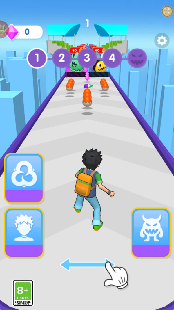 1、通过左右滑动屏幕来控制角色横向移动,向上滑动屏幕可让角色跳跃,向下滑动屏幕则触发滑铲动作,以此躲避各种障碍物与对手。