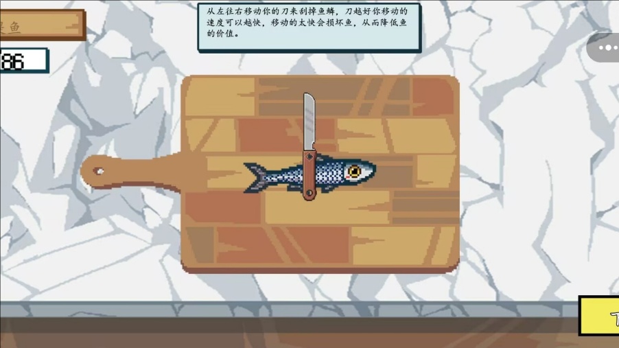 3、策略性操作方面的挑战,刮鳞过程中要把控好刀的移动速度,防止鱼肉受损而对收益造成影响。
