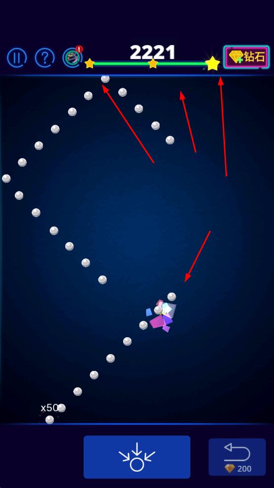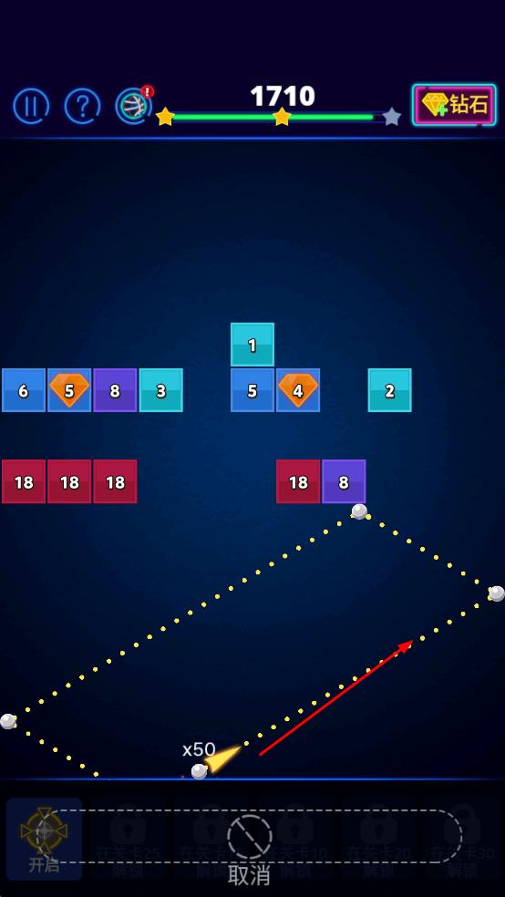 2、积累高分突破关卡:目标是击碎尽可能多的砖块,击碎砖块可获得分数,当分数累积到特定数值时就能通过关卡,玩家需要在每一关力求取得更高的分数。