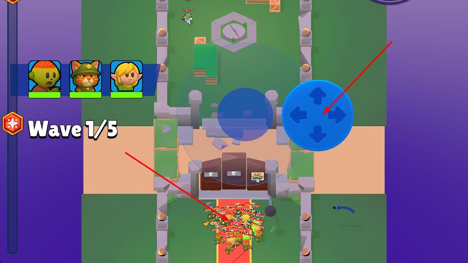 3、进入战斗界面后,左侧的角色栏、上方显示的Wave1/5波次标识都清晰可见。你可以通过操控右侧的方向键,指挥已选中的角色移动,灵活调整他们的站位并释放技能,以此持续抵挡敌人的攻势。
