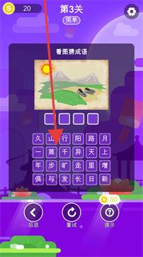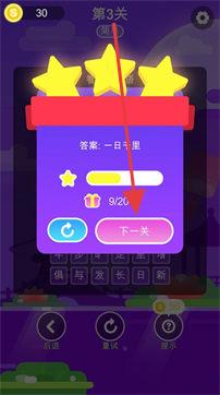 2、进入关卡后,留意图片中的提示信息,从下方的字库中挑选合适的汉字,拼凑出与之匹配的成语(例如“一日千里”)。