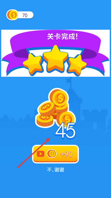 3、完成关卡后可获得【45】金币奖励,还能通过观看广告额外领取【90】金币。