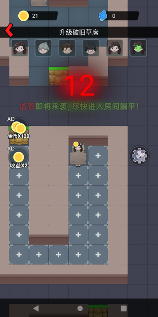 4. 进入地图后,玩家得快速找个合适的房间睡觉,以此发育并赚取金币;倒计时结束后,梦魇就会攻击房门!记得解锁各类武器来防御哦!