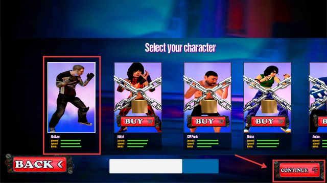 1、进入角色选择界面后,选定【Nathan】这个角色,接着点击界面右下角的【CONTINUE】按钮,即可为进入紧张刺激的格斗对战做好准备。