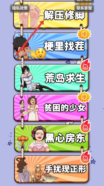 1、打开佳作界面后,会呈现多个游戏选项,从中找到解压修脚选项并点击,就能进入关卡选择场景。